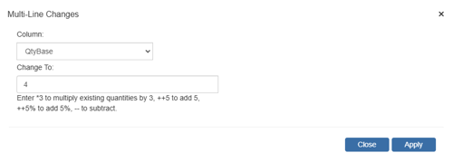 Set the drop-down to "QtyBase" to apply the specific quantity or a quantity to all the selected items. If you want to multiply all the selected line items quantities by a number, simply type in an asterisk symbol before the number like “*3” (without the quotation marks) on the Apply Quantity window to multiple all the quantities by 3. You can also enter "++5" to add 5 to the quantity or "--5" to deduct 5 from the quantity.