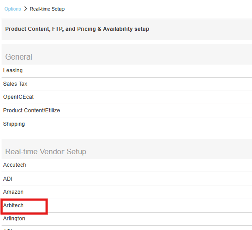 1. To setup Arbitech Real-time pricing and availability navigate to Setup > Options > Real-time and select Arbitech.