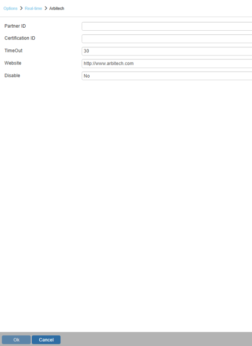 2. Input your Partner Id, Certification ID, TimeOut, Website, and select whether or not you would like to disable the data source and click [OK].