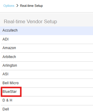 1. To setup BlueStar Real-time pricing and availability navigate to Setup -> Options -> Real-time and select BlueStar.