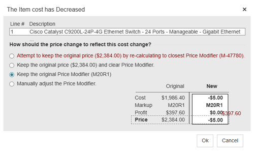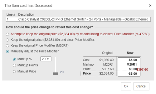 It will allow you to choose from three options that will reflect the price and cost change. When the price of a product is calculated using the cost of that product (such as Markup or Margin) and you've manually changed the cost on the Document Items tab or used the refresh with latest price or best price features, QuoteWerks can adjust the final price in one of four ways: