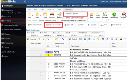 Contacts are added to a quote by navigating to the Lookup Contact window. This can be done by clicking on the Contacts dropdown menu, the contact icon on the left navigation panel, or by clicking on the magnifying glass on the Sold to/Ship to tab.