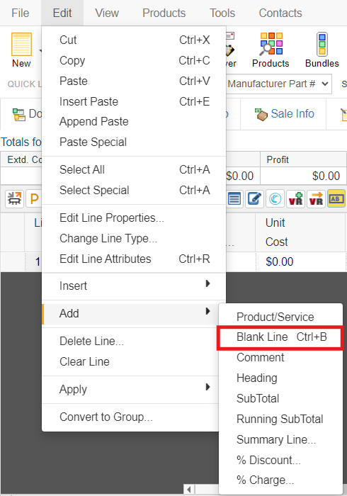 If you need to enter a product/service into a quote on the fly, simply select the Edit -> Add -> Blank Line menu and manually type whatever product/service information you’d like — description, price, part number, etc. — into the quote. Alternatively, you can insert a blank line at the current line item position in the quote by selecting a line item in the quote, then clicking on the Edit -> Insert -> Blank Line menu.