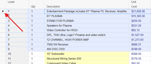 ]. This area is called the record selector; when you click on the record selector, the entire line item will highlight. An item is in focus when the arrow next to it is white, as shown below: