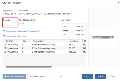 You can also set the quantity when you add a product to the quote, if you're using the Add Item Assistant: