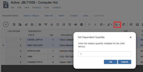 2. Select both items by holding down the ctrl key and clicking on each of them. Make sure the first selection you make is the anchor product or the product you want to control what the quantities will be for it's child product. Click the Dependent Quantity button as pictured below. This will open the Set Dependent Quantity window. This is where you can put the quantity you want the child number to increment for every 1 added of it's Parent.