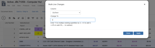 With one or more line items selected, you can select the Edit -> Apply -> Multi-Line Changes menu. Set the drop-down to "QtyBase" to apply the specific quantity or a quantity to all the selected items. If you want to multiply all the selected line items quantities by a number, simply type in an asterisk symbol before the number like “*3” (without the quotation marks) on the Apply Quantity window to multiple all the quantities by 3. You can also enter "++5" to add 5 to the quantity or "--5" to deduct 5 from the quantity.