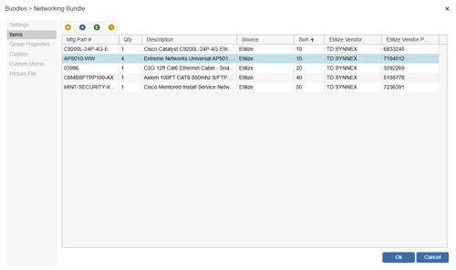 Example: A grouped bundle for switch could include an item for access points quantity of four, so that each switch ordered will come with the four required access points: