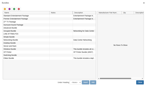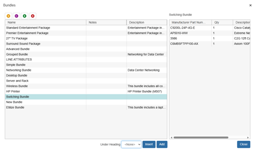 To add a bundle to a quote simply select the bundle you would like to add and click on [Insert] or [Add]. You can choose to add the bundle under an existing heading by selecting the Under Heading button and selecting a heading name from the quote.