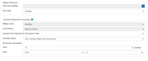 The Group Properties option enables users to set the Grouped Bundle to a single recurring monthly revenue amount (Recurring Groups). All the individual items in the bundle are totaled and an Annual Percentage Rate (APR) and a term (e.g. 12, 24, 36 months) can be set. This feature is useful for Haas quoting also.
