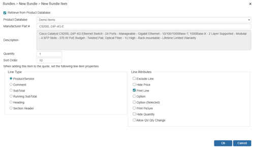 [New Line] button will enable users to add static items to bundles. These can be used for comments, subtotals, running subtotals, or heading lines that do not currently exist in a product database. This makes it easy to add these various line types to the bundles without having to first create them in a product database.