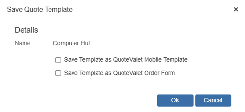 Here, you have the option to check whether you want to make this template available on QuoteValet as a QuoteValet Mobile template OR as a QuoteValet Order form.