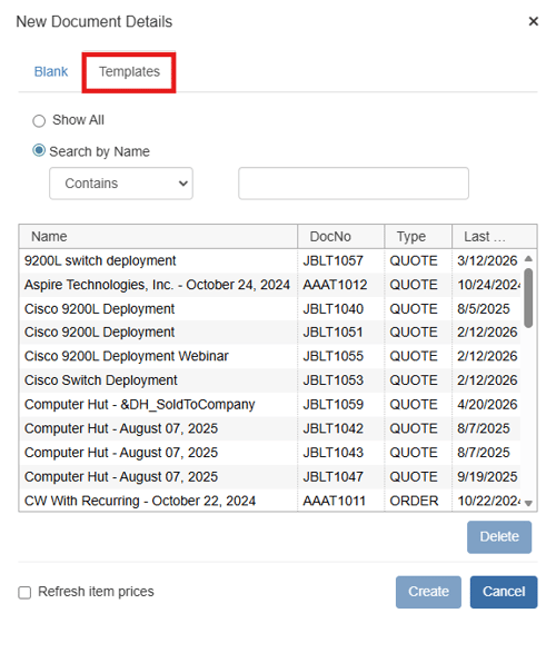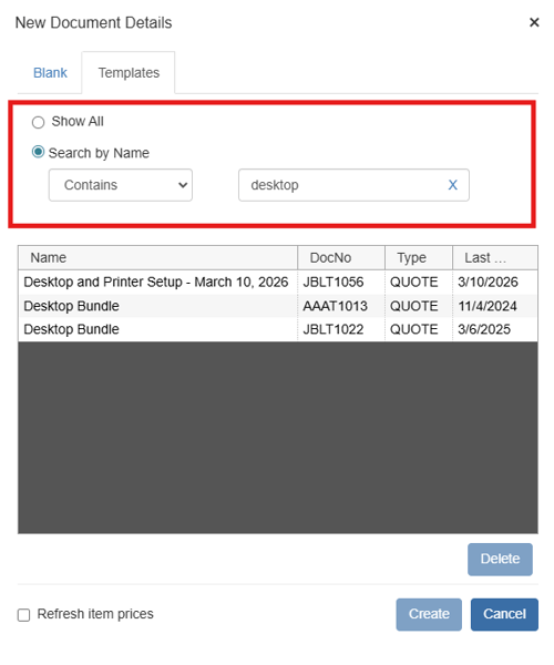 Click the [Show All] radio button to view all available templates. To search for a specific template, click on the [Search by Name] radio button and choose "Begins with, Contains, Ends with, or Search Query" search parameters and then enter in your search terms. You can also sort the templates by clicking on the columns (Name, DocNo, Type, Last Modified).