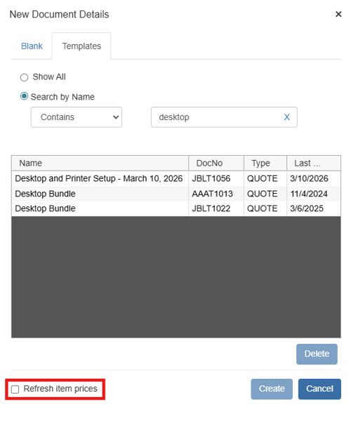 As the template is used to generate a new document, if this checkbox is checked, the item prices will be updated with the current pricing. Also, if the items are no longer in the product database, you will receive a notification of this alerting you to this issue.