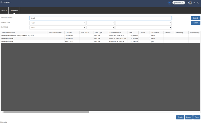 Once you have entered in your search criteria, click search and the results will be displayed. Simply click on the document you would like to edit and click [Open] to open it. If you want to delete a template instead of just editing it, with the document highlighted click on the [Delete] button below the documents. This will permanently delete the template from your installation. Additionaly you can export you search results by clicking on the [Export] button.
