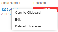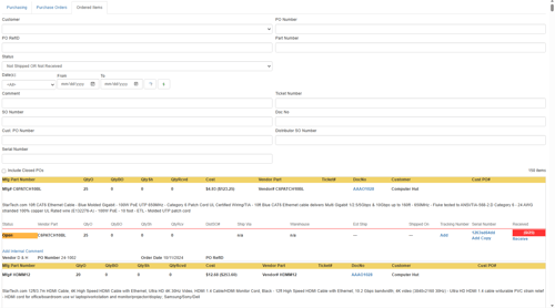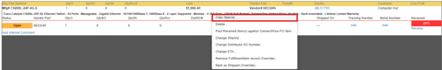 The purchase order items can be accessed from either the Purchase Orders tab or the Ordered Items tab. The individual items tracking numbers, serial numbers and shipping statuses will update automatically when ordering electronically. For any items that were not ordered electronically, you can manage their statuses, tracking numbers, and serial numbers through the Purchase Orders and Ordered Items tabs. The right-click menu options will only be available on the Purchase Orders tab.