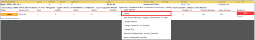 To delete an item, navigate to the Purchase Orders tab. Select an item from the selected purchase order, right-click on it, and click Delete...