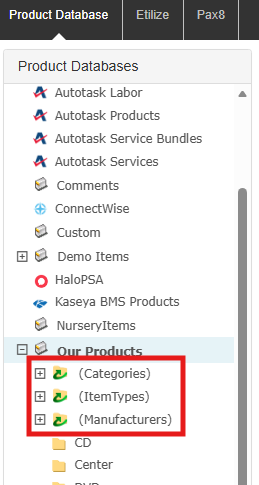 When a Dynamic folder is clicked on, QuoteWerks will query the database to find a list of all the different category, item type, or manufacturer names entered into the set fields of each product. Then QuoteWerks creates a folder for each of the available fields as a child folder of the primary Dynamic folder. These child folders are also dynamic “Auto” folders and therefore cannot be manually created, renamed or deleted.