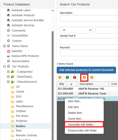 There are two ways to associate products with folders in QuoteWerks. The first is to right-click on one or more items and click the menu option of "Associate XX items with a folder...".
