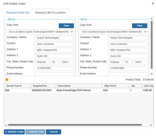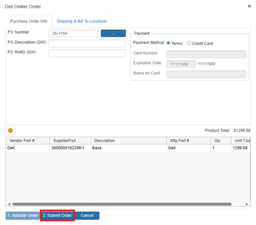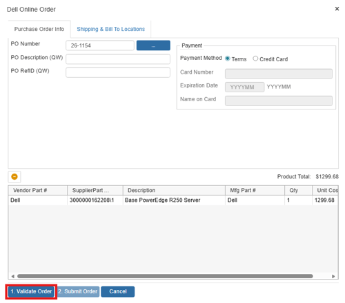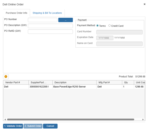 4. This opens the Dell Online Order window where you can assign a PO number, PO Description, PO RefID, and payment method.