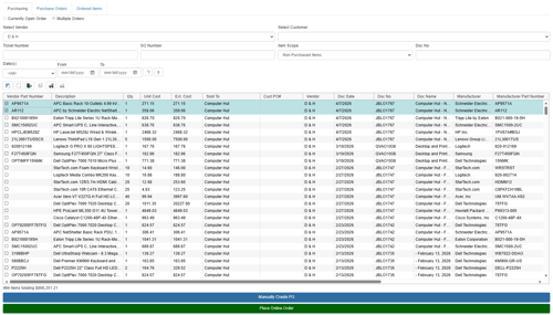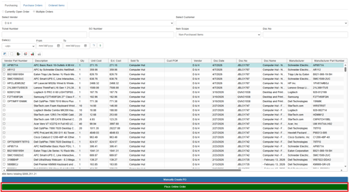 Users can select documents based on a specific date or a range of dates by adjusting the date filter at the top of the Purchasing Window. Additionally, users can filler by the customer by clicking on the drop-down of the “Select Customer” menu. Only customers and vendors within the filter date range are displayed.