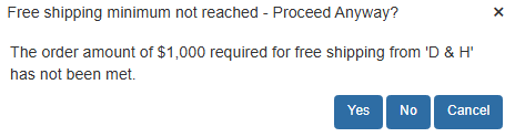 If you have specified a vendor minimum amount required for free shipping on the Vendor Maintenance menu in QuoteWerks, a window will ask if you'd like to proceed anyway or add more items to the PO before creating it.