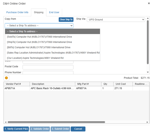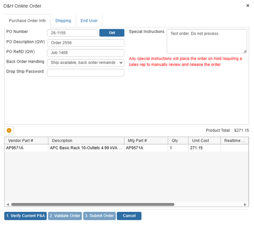 End users are able to override the pricing when performing the online ordering with D&H. However, unlike the other vendors, D&H does not support line-item level comments.