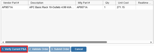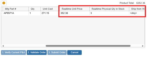 Click on the [1. Verify Current P & A] button (P & A stands for Pricing & Availability). This step accesses the D&H website in the same way the Real-Time Data module does and returns the current pricing and availability of the line items.
