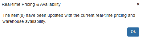 You may also receive warning notifications indicating there are pricing differences between the price on the QuoteWerks order and the real-time price. This can occur often since real-time prices change often. You are notified of this so that you are aware of this price difference. With this knowledge you can make a determination as to whether or not this is simply a small price variance or a significant price difference which would require your verification before proceeding.