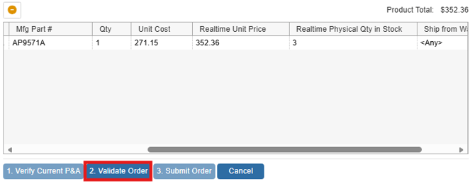 Once the P & A Request is completed, the [2. Validate Order] button will become available. Validating the order will validate all the information entered on the order form and then will validate all the items on the order form.