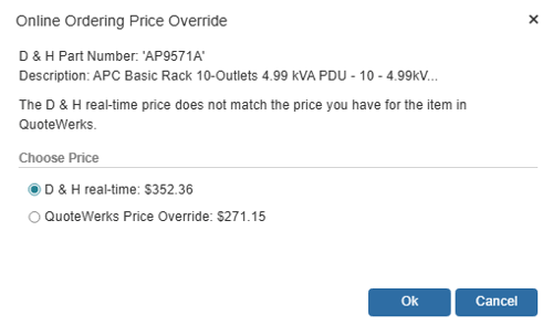 NOTE: There is a good chance that the Unit Price for the items in the QuoteWerks order may be different than the real-time Unit Price. When this happens, you will receive a series of warning messages alerting you to this discrepancy. As a procedural control you could update the QuoteWerks order with real-time pricing and availability (using the Tools -> Refresh with latest pricing menu) before beginning the online ordering process, which would ensure that the Unit Price in the QuoteWerks ORDER would be the same as the real-time Unit Price retrieved from D&H during the ordering process