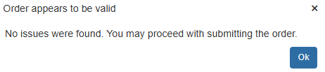 Once any validation issues have been addressed you will receive notifcation that the order is valid and that you are able to proceed with submitting the order:
