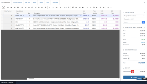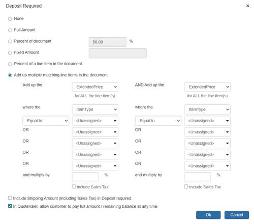 You can also select Percent of a line item in the document which will calculate the deposit based on that single line item. Additionally, by using the Add up multiple matching line items in the document option, you can choose to add up multiple line items where the item type, manufacturer, manufacturer part number, vendor, vendor part number, and custom text fields match the criteria specified. You can add up items that are "Equal to", "Not Equal to", "Contains", or "Begins with". This enables you to set the deposit for only a certain amount of line items. So if the quote contains a few items that require a deposit but others that don’t, you can easily calculate the deposit automatically using this summary filter.