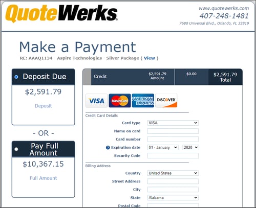 The Deposit Required feature can be used in conjunction with QuoteValet, allowing a customer to put down a deposit when they accept the quote. For more information on payments through QuoteValet and accepting deposits, see QuoteValet.