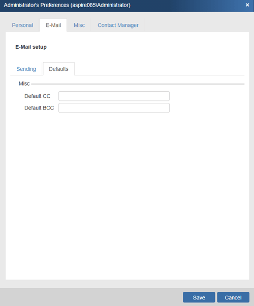 On the Defaults tab you can enter the default CC (or BCC) e-mail address to use whenever creating a new e-mail, by entering it here. You can use this to for example always CC the sales manager on all quotes emailed. Additionally, you can use a macro field (like &DH_CustomText01) to have the CC (or BCC) default to an email address that is located in the CustomText01 field on the Custom tab of the Quote WorkBook.