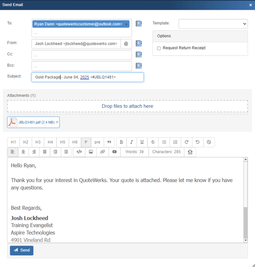 QuoteWerks enables you to send your quotes, orders, and invoices by email to your customers directly from within QuoteWerks. No need to switch to another software package to send the email.