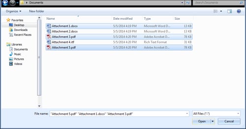 The Attachment line pre-fills with the quote formatted as a PDF file. You can attach other files to this e-mail by selecting the [Attach] button and browsing for your desired file. To attach multiple files, simply hold down the [Shift] key on your keyboard to select a consecutive range of items, or the [Ctrl] key to select multiple individual items not necessarily in consecutive order (as shown below):