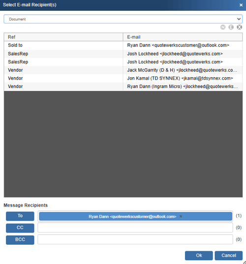 This selection displays a single list of all the email addresses related to the current open document. This includes the QuoteWerks users (on document), QuoteWerks Vendors (on document), Sold to (on document), Ship to (on document), Bill to (on document), and Sales Rep and Prepared by email addresses.