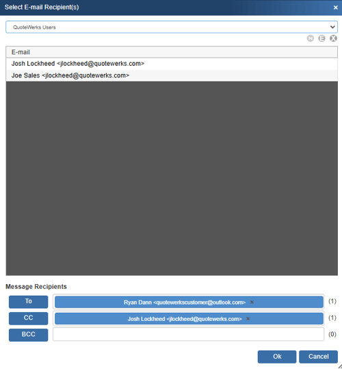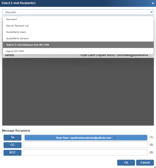 This will be a list of all email addresses associated with the MS CRM account or contact record that is linked to the Sold To fields in QuoteWerks. If linked to a MS CRM account record, all the email addresses associated with the account and all the email addresses associated with the contacts under this account will be displayed.