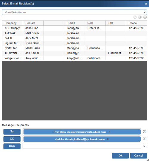 This selection displays a list of all the Vendors set up in QuoteWerks that have contacts with email addresses set up.