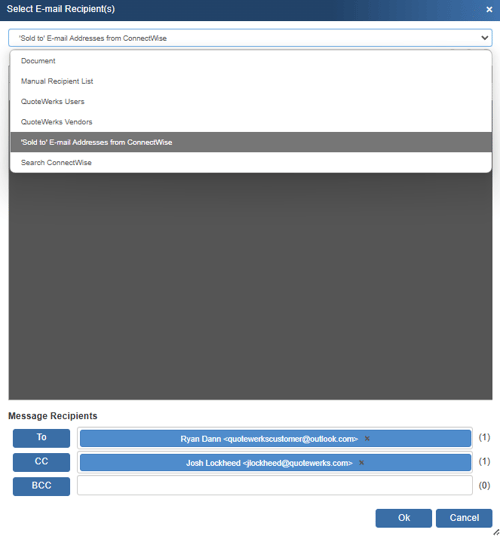 This will be a list of all email addresses associated with the ConnectWise contact record that is linked to the Sold To fields in QuoteWerks.
