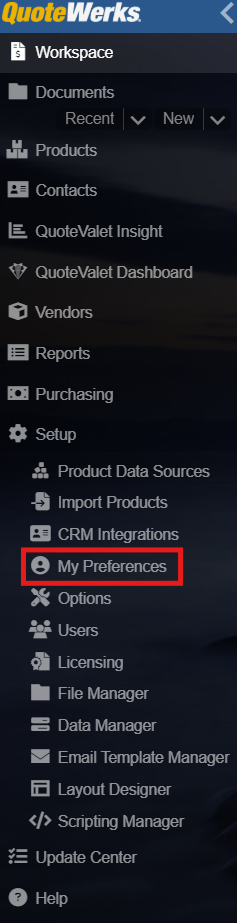 Each QuoteWerks user can personalize QuoteWerks by specifying their own preferences. The user preferences can be personalized by navigating to Setup -> My Preferences for the currently logged in user.