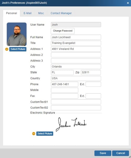 A Sales Rep picture and Electronic Signature picture can also be added on this tab. These pictures can be included on your layouts to add a personal touch to every quote sent to your customers. The pictures can also be removed by clicking on the