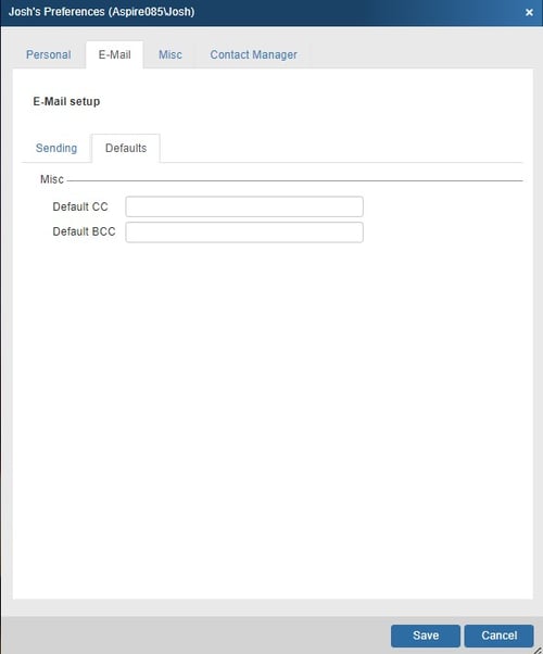 The Defaults Tab allows you to set default CC and BCC contacts for emails sent from this user.
