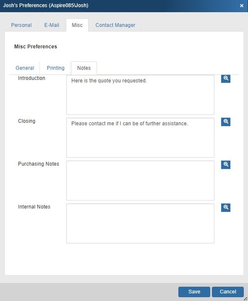 NOTE: Internal notes will not print on the quote.