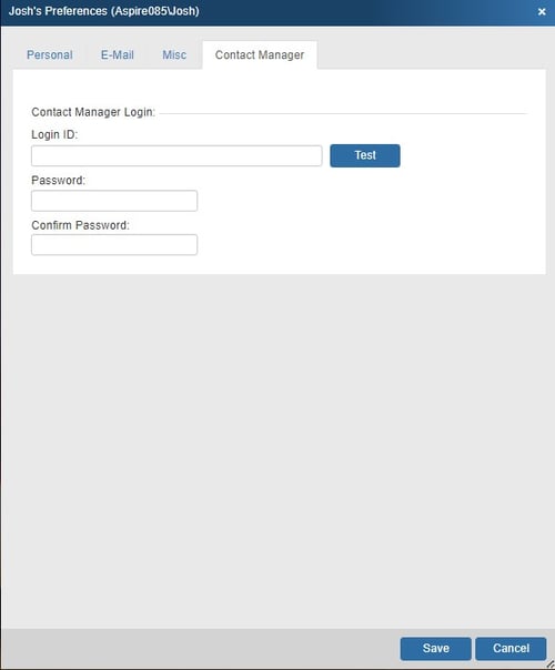 The Contact Manager Tab is where you input and store your Contact Manager credentials. Additionally, you can test the connection by clicking the Test button. Once all changes have been made click Save to exit.