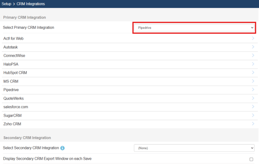 1. To begin, navigate to Setup -> CRM Integrations. Select the CRM you would like to integrate with from the Select Primary CRM Integration dropdown menu.