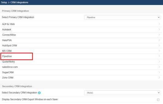 2. Click on the name of the CRM you would like to integrate with. In this case we are selecting Pipedrive.