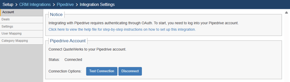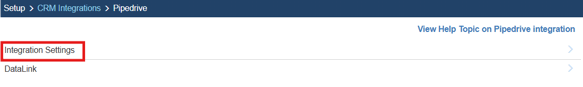 3. Click on Integration Settings to access the settings for the selected integration. You can also select "View Help Topic on Pipedrive Integration" to be directed to the knowledge base for the selected CRM's integration.
