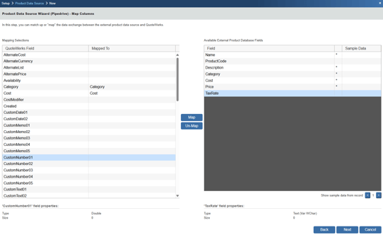 4. Map the fields from your CRM to fields in the QuoteWerks system by selecting the fields you wish to map and clicking the Map button. Once all desired fields have been mapped click the Next button.